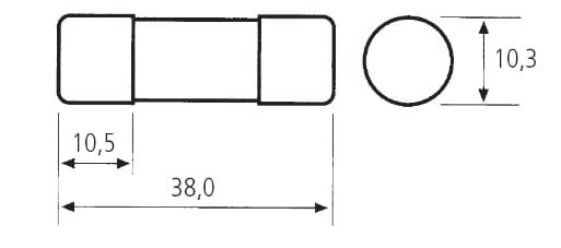 Corpo in steatite adatto a sopportare sbalzi termici molto elevati, riempito di sabbia di quarzo. L’elemento di fusione è composto da una lamina di rame ricoperta in argento. La doppia capsula ricoperta d’argento evita l’ossidazione e mantiene le caratteristiche immutate nel tempo. Tutti i fusibili cilindrici sono progettati per ridurre al minimo la potenza dissipata il cui valore è indicato sul corpo del fusibile stesso. Fusibili CH. Grandezza : CH10, SCH10 (10,3x38)