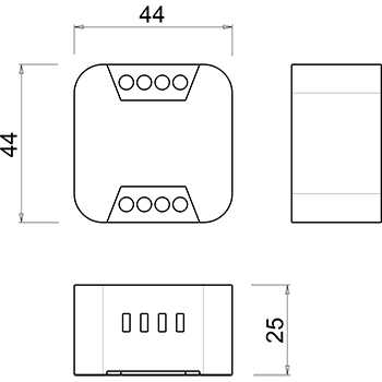 Easy RGB push è un sequenziatore RGB che permette di controllare dispositivi LED RGB in corrente costante. Il dispositivo dispone di un’uscita a 3 canali e può essere utilizzato per creare effetti RGB, con modalità di tempo impostabili da pulsante (normalmente aperto). La tensione di alimentazione è da 12 a 48Vdc. Il dispositivo permette di regolare la tonalità del colore e i tempi di rotazione colore del dispositivo LED RGB mediante un pulsante NA: Impostazione della velocità di rotazione del ciclo RGB.Selezione del tono colore desiderato. La curva di regolazione ottimizzata permette una dissolvenza morbida dei colori, garantendo il massimo comfort visivo. In base alla versione, questo dispositivo permette la creazione di effetti di bianco dinamico o di cicli RGB con diverse velocità di rotazione del tono colore, che può essere selezionato a piacere. I dispositivi vantano una serie di protezioni: sovratemperatura, sovralimentazione, sottoalimentazione, inversione della polarità di alimentazione, corto circuito in uscita, limitatore di corrente in uscita. Ingresso 12-48Vdc. uscita 3x350mA. Gruppi RGB controllabili 1-3@12Vdc / 1-6@24Vdc / 3-12@48Vdc N° LED controllabili 9@12Vdc / 18@24Vdc / 36@48Vdc.