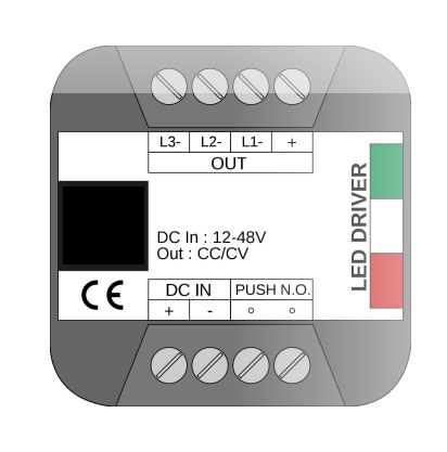 CARATTERISTICHE: Ingresso: DC 12-24-48Vdc. Comando: pulsante. Controlo del bianco dinamico o colore RGB. Uscite in tensione o corente. Efficienza tipica 98%. Circuito azzeramento delle corenti disperse. Accensone e spegnimento morbidi. Curva di egolazoneottimizzata. Range di temperatura esteso. Varianti a tensione costante (anodo comune). Output: 3X1.6Amax.