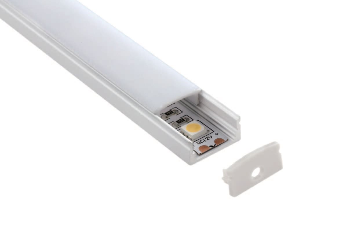 KIT PROFILO SUPERFICIE - Profilo alluminio superficie L. 2 mt per strisce led completo di accessori, confezionato singolarmente con nr. 1 diffusore opaco in policarbonato, nr. 2 tappi chiusi, nr. 1 tappo con foro, nr. 4 clips di montaggio il tutto incluso nella confezione. Potenza MAX consigliata 15w/ml. Finitura: Alluminio.