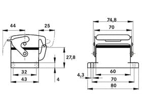 Robusta custodia industrialeLa robusta custodia bassa in metallo dispone di un ingresso cavo laterale, piolini per una leva doppia e viene fornita con un raccordo intermedio.Alette maneggevoli per l’estrazione pratica del connettoreIndice di protezione testato UL50E