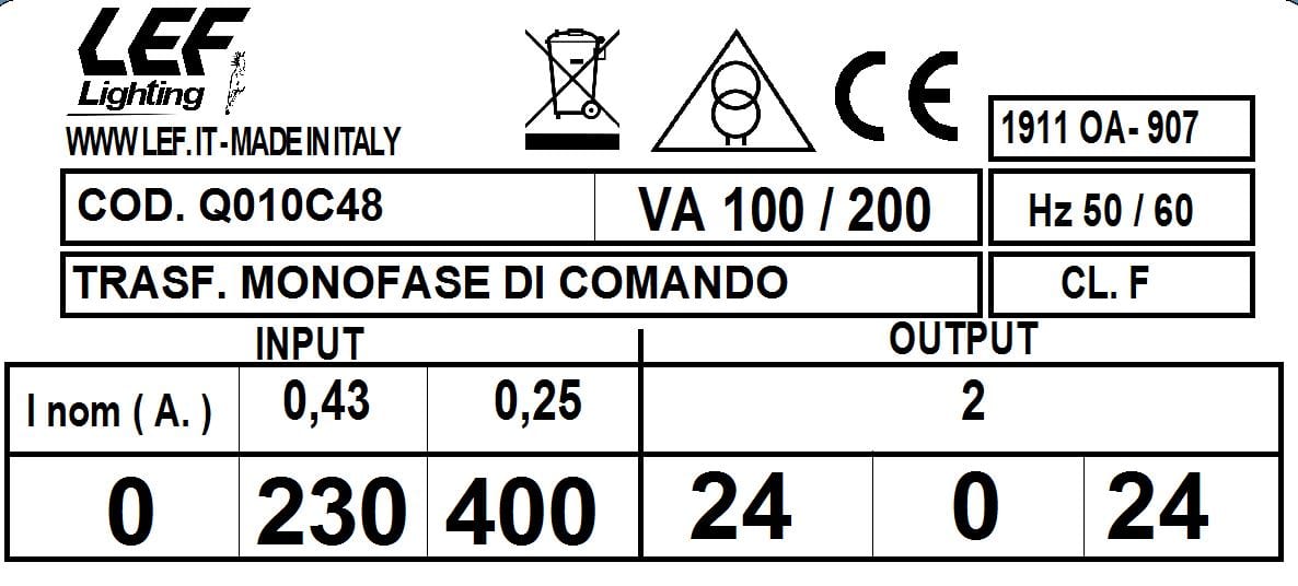 L.E.F. SRL - LEFQ010C48 T.M. 100VA 230.400V / 24.0.24V - Q010C48