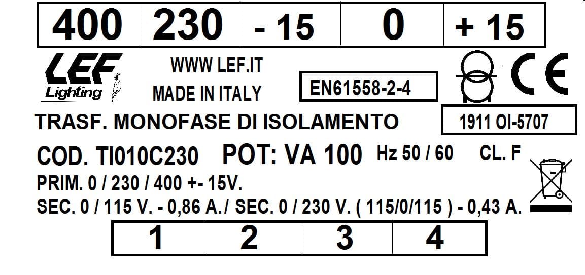 L.E.F. SRL - LEFTI010C230 T.M. 100VA 230.400V / 115?230V - TI010C230