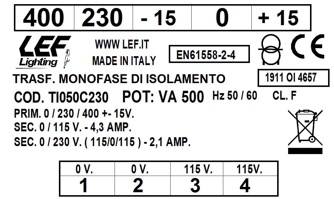 L.E.F. SRL - LEFTI050C230 T.M. 500VA 230.400V / 115?230V - TI050C230