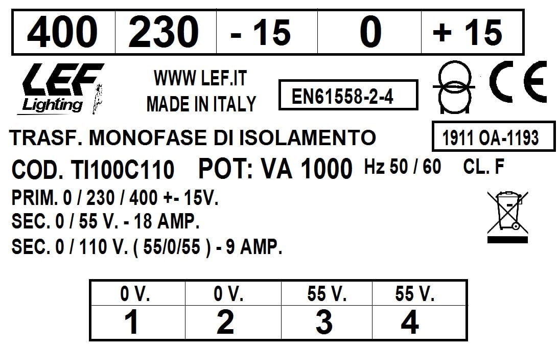 L.E.F. SRL - LEFTI100C110 T.M. 1000VA 230.400V / 55?110V - TI100C110