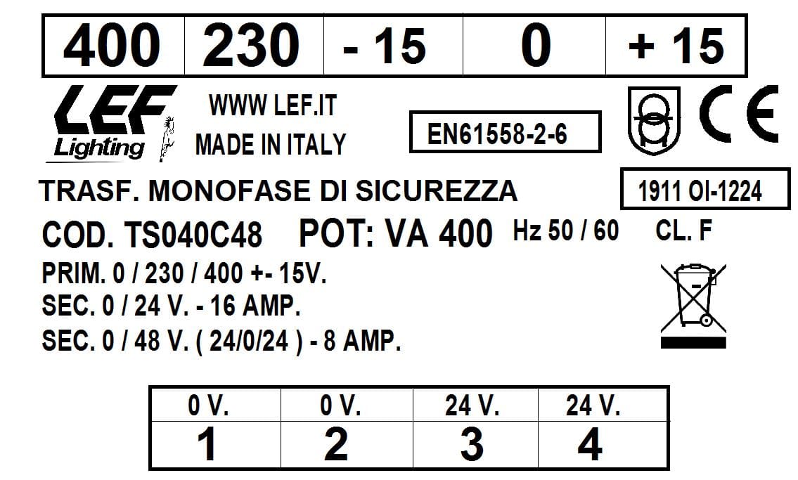 L.E.F. SRL - LEFTS040C48 T.M. 400VA 230.400V / 24?48V - TS040C48