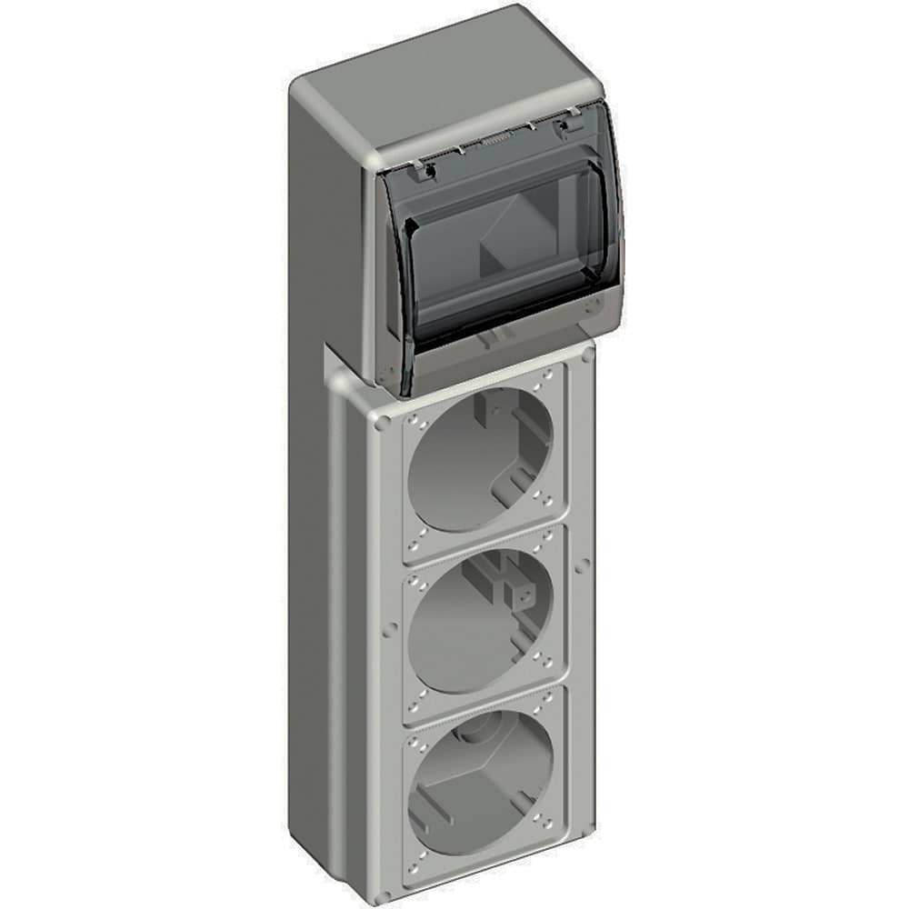 Quadro con flange componibili IP44, IK09. Materiale: corpo in ABS - finestre in policarbonato. Fissaggio a muro senza dover aprire il centralino. Completi di flange per l’installazione di prese da pannello. Versione con flangia per 3 prese da pannello, guida DIN 4+1 moduli e portello trasparente