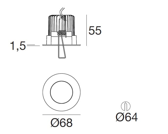 L'apparecchio presenta una classe di isolamento III ed è installabile a soffitto, con foro tondo di diametro 64 mm (nel cartongesso).