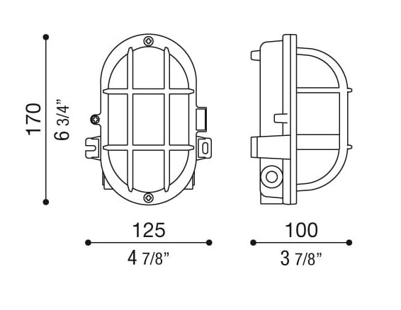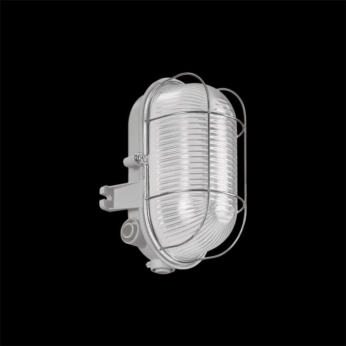 Adatto anche ad uso esterno. Base in poliammide. Diffusore in vetro trasparente. Gabbia in metallo zincato. Riflettore in alluminio tipo L2-1060. Viti in acciaio inox. Predisposizione triplo ingresso tubo 16/20 mm