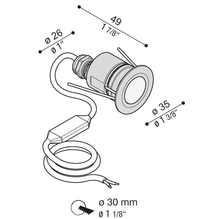 Adatto per installazioni a parete e controsoffittature in cartongesso, anche per uso esterno. Idoneo per incassi da terra ad uso calpestabile, carico max 500 kg, fissaggio mediante armatura da incasso fornita a parte. Prodotto finalizzato all’impiego di sorgenti luminose a LED per luce di accento e segnalazione. Corpo e ghiere in acciaio AISI316L. Diffusore in vetro temprato. Guarnizioni in silicone. 1.5 m di cavo di alimentazione H05RN-F pre-cablato e bloccato tramite pressacavo in Ottone Nichelato. Lamolla di ritenuta si adatta sia per applicazioni che prevedono l'utilizzo di armatura da incasso che direttamente in controsoffittature in cartongesso. Dimmerazione disponibile. Bulloneria in acciaio inox A4 o AISI 316L. Versione in corrente costante: tutti i cavi vengono forniti integrati di un sistema elettronico che consente il collegamento non polarizzato del faretto. Il dispositivo elettronico inoltre, impedisce l'interruzione di linee di faretti collegati in serie nel caso di guasto di un singolo prodotto. La speciale guaina che riveste il circuito protegge il faretto dalle infiltrazioni di acqua e umidità. Utilizzare esclusivamente alimentatori di tipo SELV o equivalenti. Versione in tensione 12/24 V: Tutti i cavi sono provvisti di una speciale guaina che protegge il faretto dalle infiltrazioni di acqua e umidità. LED 3000K (3). Alimentatore escluso. Nessun rischio fotobiologico, RG0 gruppo di rischio esente (EN62471). Versione ghiera tonda, possibile scelta di 3 differenti ottiche. Temperatura massima rilevata sul vetro 65°C. Tipo lampada: 1 LED - 500mA 180 lm - 2W - 4.8V real Max output lm 148 . Versione a led senza alimentatore. Ottica: Diffuso.