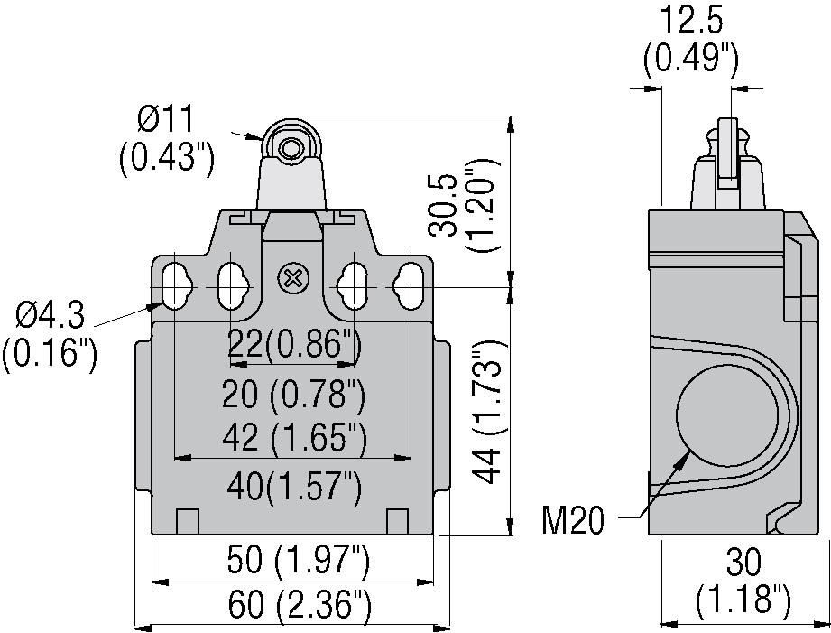 FINECORSA SERIE K, AD ASTA CON ROTELLA, 2 INGRESSI LATERALI PER CAVI. DIMENSIONI COMPATIBILI EN 50047, CUSTODIA PLASTICA, CONTATTI 1NA+1NC A SCATTO. ROTELLA IN PLASTICA