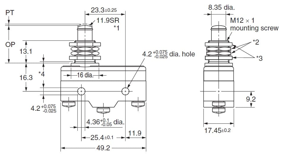 Finecorsa micro Z, 1 contatto in scambio 15 A/250 Vc.a., azion. pulsante incassato, PS media, term. saldare