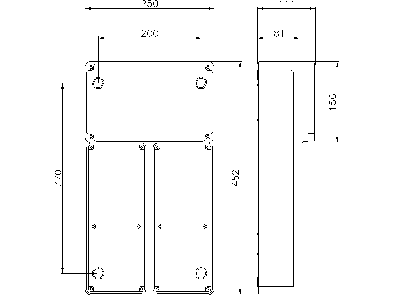 Quadri stagni flangiati ad alta capacità per installazione a parete di prese con interruttore di blocco e base portafusibili 16A - 32A - 63A e prese con interruttore di blocco senza base portafusibili da 63A. N° prese installabili: 2. Potenza dissipabile: 40W. Dimensionie: 250x452mm. Grado di protezione IP55