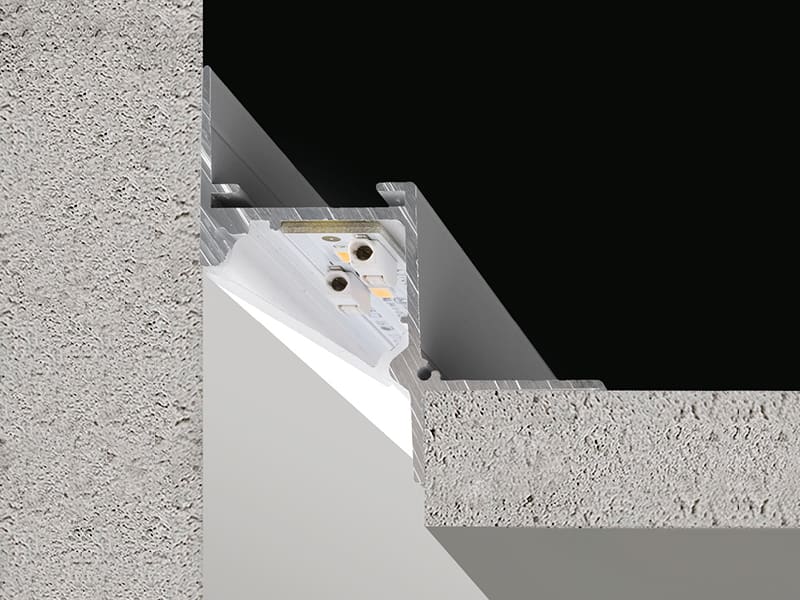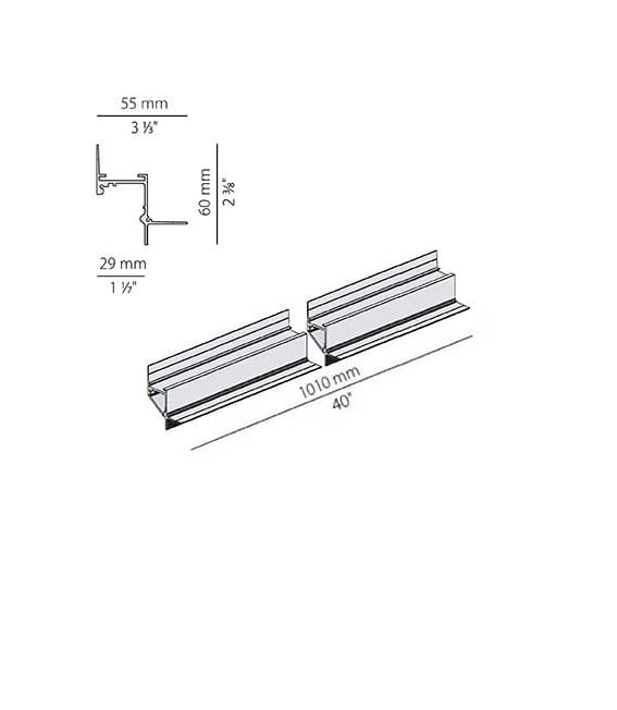 Profilo componibile per installazione incassata a soffitto o parete in ambienti interni, con emissione indiretta. Struttura a scomparsa per l'incasso in cartongesso, in alluminio estruso con verniciatura a polvere in colore bianco RAL 9003. Dissipatore in alluminio estruso. Schermo diffusore in policarbonato estruso con finitura opalina. Moduli luminosi e alimentatore da ordinare separatamente. Accessori di fissaggio, giunzione e chiusura da ordinare separatamente. Potenza assorbita dal sistema max 25W/m. Sorgente luminosa LED. Distribuzione luminosa fascio diffuso. Alimentazione 24V DC. Driver remoto non incluso. Peso 1,4450Kg. Grado di protezione IP20. 1010 mm