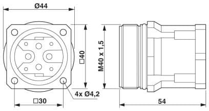 Gerätesteckverbinder, Vorderwand, gerade, Schraubverriegelung, M40, Polzahl: 4+3+PE, Kontaktart: Stift, Crimpanschluss, O-Ring axial, 4x Ø4,2, geschirmt: ja, Flanschmaß: 40 mm x 40 mm, Kabeldurchmesserbereich: 0 mm... 0 mm