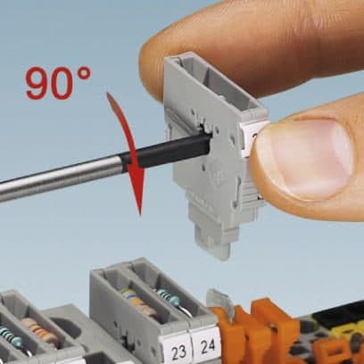 Zur Bestückung werden die Zugfederanschlüsse im Inneren des Steckers mit einem Dreh eines Standard-Schraubendrehers geöffnet bzw. geschlossen. Einsetzbar in allen Trennklemmen ...-TG mit 5,2 mm Breite oder höher, aus den Baureihen PT, ST, QTC und UT.