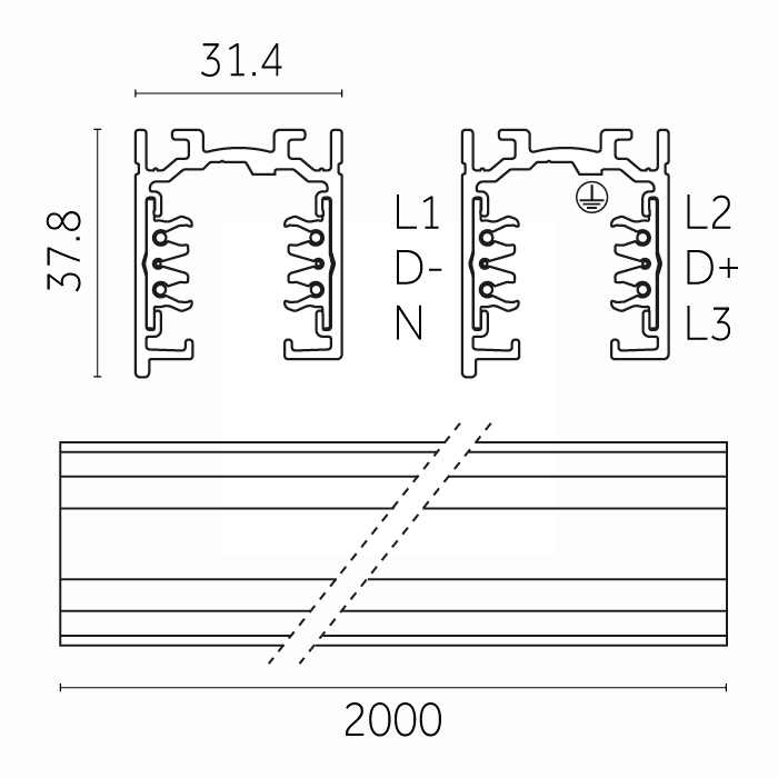 Binario 3 Accensioni + DIMM/DALI - Binario standard. 2000 X 31,4 X 37,8mm. 2,1Kg - Bianco.