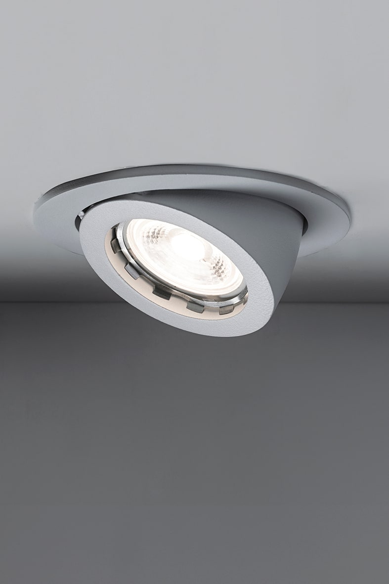 Faretto ad incasso estraibile e orientabile su ununico asse di 45?. Con attacco GU10 che consente di montare lampadina LED. Struttura in metallo, disponibile in sei finiture: bianco, cromo, grigio, nero, nickel opaco e oro lucido. Cassaforma per installazione in muratura da ordinare come accessorio .