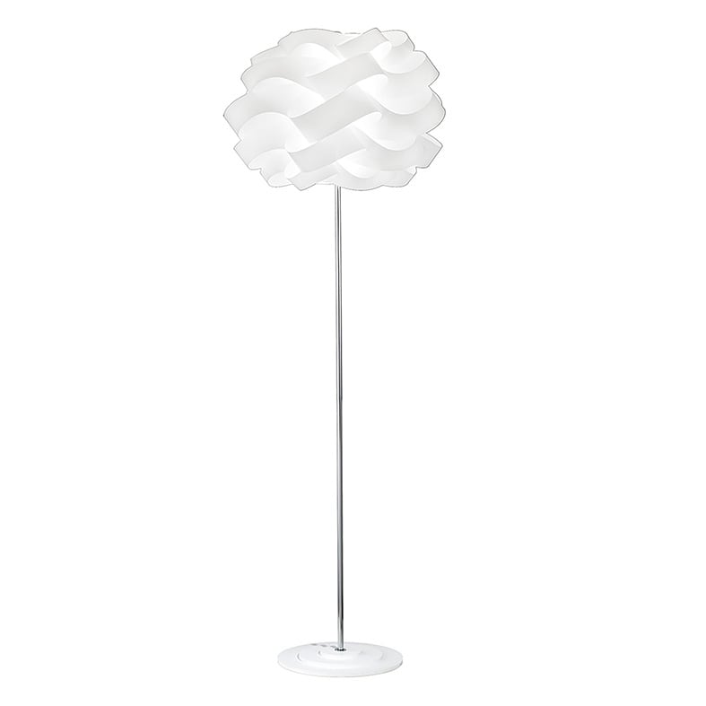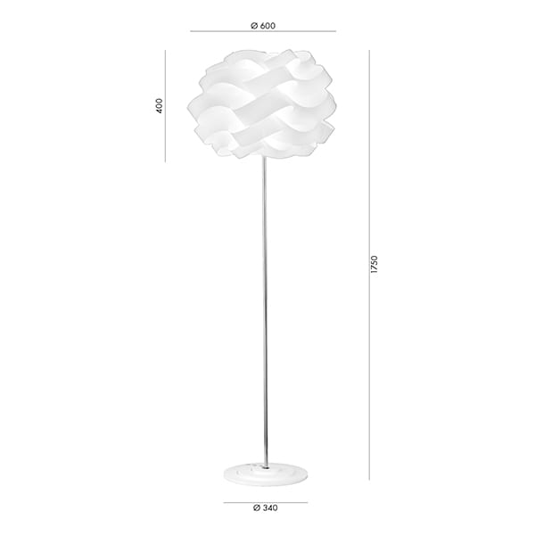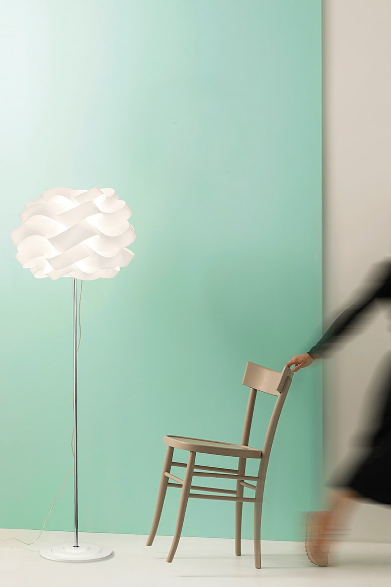 Lampada a sospensione e da terra con diffusore dalle linee morbide ed avvolgenti. Base bianca e stel o cromato per la versione a terra, rosone e stelocromato per la versione a sospensione. Attacco E27 che consente di montare lampadina a LED.