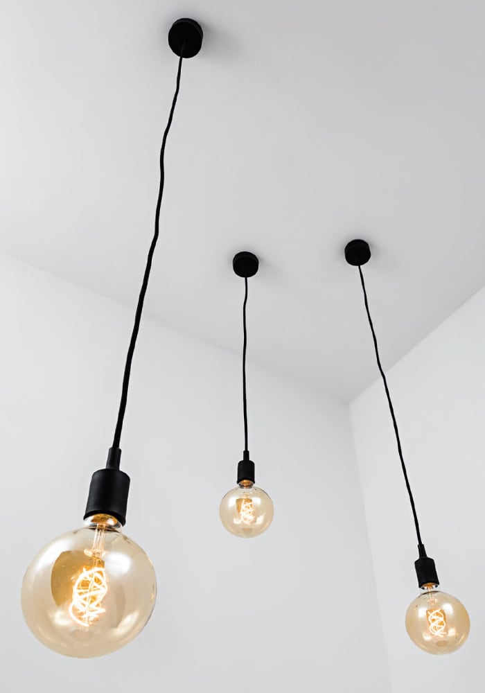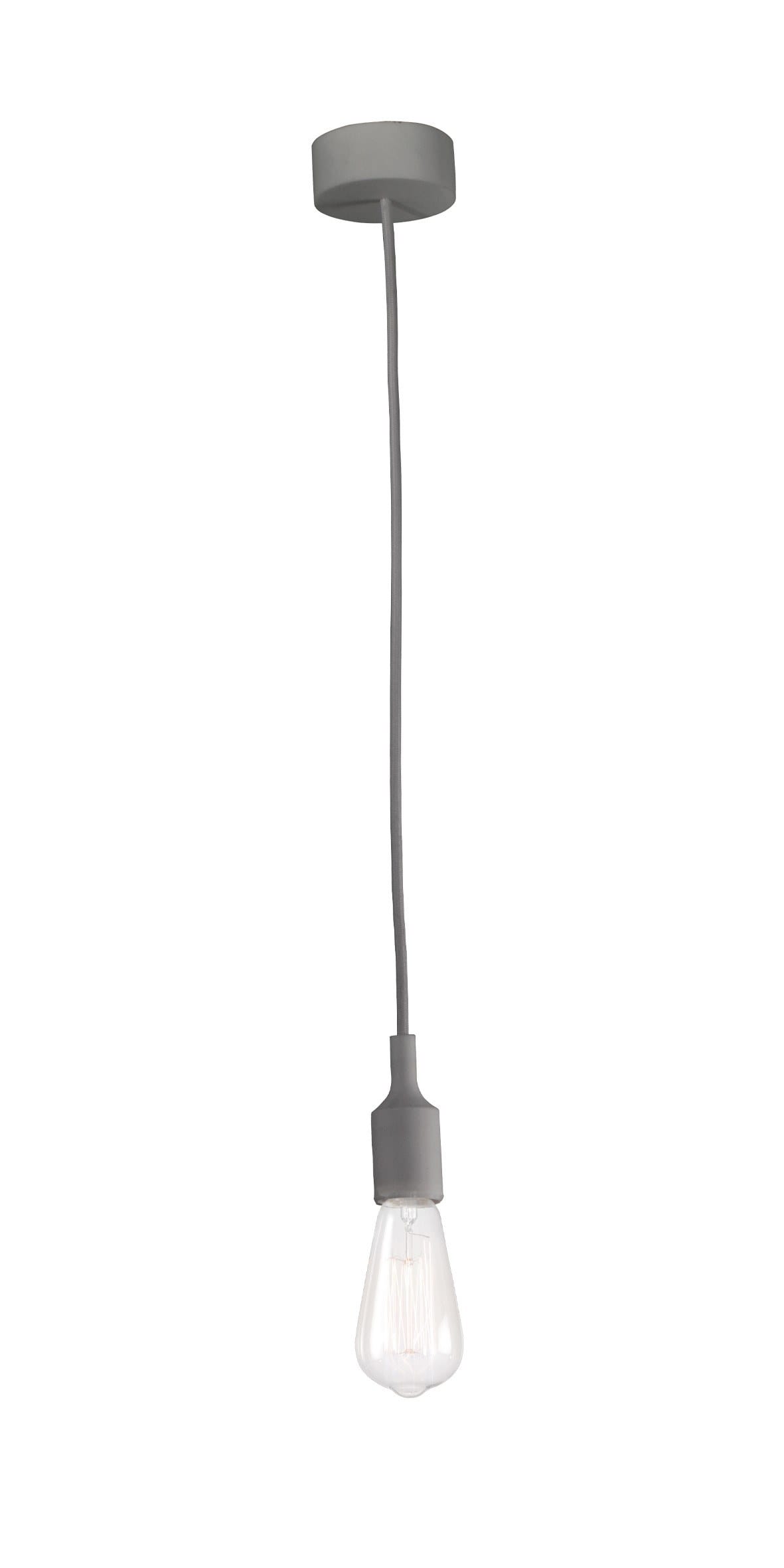 Lampada a sospensione singola con portalampada insilicone e cavo in tessuto, in tinta con la struttura e il rosone. Proposta nelle finiture bianca, nera, grigia, rossa e gialla. Attacco E27 con lampadina a vista, che consente all'utente di montare una lampadina a sua scelta, personalizzando ulterio rmente il prodotto.