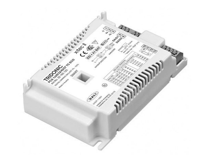 Descrizione del prodotto: Reattore gestito con microprocessore y II. Classe energetica massima CELMA EEI = A1 BAT 1. Regolazione precisa e priva di disturbi grazie al DALI, DSI, switchDIM o corridorFUNCTION. Durata vita nominale di max. 100.000 h (con ta50 °C con un tasso di mal funzionamento ≤ 0,2 % per 1.000 h). Specifiche aree di memoria riservate ad OEM. 5 anni di garanzia. Interfacce: DALI. DSI. switchDIM (con funzione di memoria + gamma di regolazione selezionabile). corridorFUNCTION (3 profili preprogrammati). Interfaccia SMART per funzionamento con sensore SMART 5D 19f e plugs corridorFUNCTION. SMART interface per SMART plug cF – per l'impostazione dei profili corridorFUNCTION. SMART interface per SMART sensor con sensore luce. Funzioni: Intelligent Temperature Guard (protezione termica). Intelligent Voltage Guard (indicazione di sovratensione e spegnimento in caso di sottotensione). Riscaldamento ottimale dei catodi a qualsiasi livello di dimmerazione. Interruzione del riscaldamento dei catodi da un livello di dimmerazione di circa il 90 % per la massima efficienza energetica (SMART-Heating concept). corridorFUNCTION con regolazione della luce ambiente. Il valore luminoso in modalità di emergenza si porta automaticamente al 15 % in modalità DC.Idoneo per i sistemi d'illuminazione di emergenza che ottemperano alla EN 50172. Riaccensione automatica a seguito alle sostituzione delle lampade difettose. Disinnesto automatico in caso di lampada difettosa.