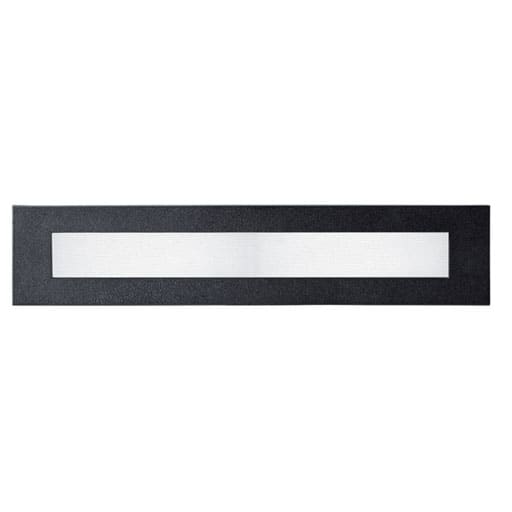 installazione: Incasso a Parete. foro incasso: Foro di incasso 355 x 85 mm. fissaggio: Molle in acciaio. corpo / struttura: Corpo in pressofusione di alluminio. verniciatura: Verniciatura in polveri di poliestere con trattamento speciale per esterni, indicata per installazioni in ambiente marino o ad alta salinità. colore: Nero. equipaggiamento: Guarnizioni in gomma siliconica. vetro / schermo: Vetro satinato temprato. pressacavo: n.2 passacavi in gomma siliconica PG9. alimentatore: alimentatore integrato per diodi LED, uscita stabilizzata 350mA dc. tensione: 220-240V 50/60Hz. fascio luminoso: Simmetrico diffondente. classe isolamento: Classe 2. peso: 1,250 kg. grado IP: 65. filo incandescente: 850 °C. grado IK: 7. lampada inclusa: si. tipo LED: Power LED. potenza lampada: 8.5 W. flusso lampada: 910 lmdurata nominale: 50000 ore L80 B20. temperatura di colore: 3000K. indice resa cromatica: 90. costanza cromatica: 4 SDCM.