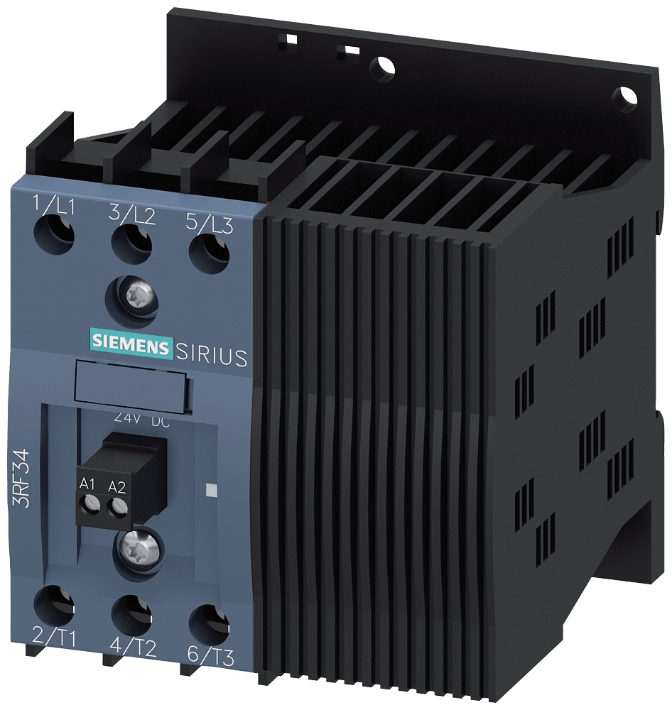 Contattore statico trifase 3RF3 AC 53 / 12,5 A / 40 °C AC 48-480 V / 110-230 V a comando bifase con commutazione istantanea morsetto a vite contattore statico SIRIUS 3RF34 per il comando di motori con frequenti inserzioni e disinserzioni, ad es. nella tecnica dei trasporti industriali. Gli apparecchi commutano silenziosamente e senza usura, per cui sono ideali per limpiego in ambienti sensibili al rumore (uffici, ospedali). Essi sono estremamente affidabili anche in caso di frequenze di commutazione elevate. Poiché il dissipatore è già integrato, è possibile linstallazione diretta nel quadro elettrico. La forma costruttiva compatta fa risparmiare spazio sulla guida DIN. Gli apparecchi hanno omologazioni internazionali (ad es. IEC e UL/CSA). I contattori statici sono fornibili in due larghezze costruttive per diverse potenze e tensioni nominali di impiego. Essi sono progettati per il comando AC o DC e sono disponibili con morsetti a vite o a molla. Come accessori sono disponibili moduli di collegamento e adattatori di collegamento nonché targhette identificative. Semplice, efficiente, sempre attuale - il sistema modulare SIRIUS.