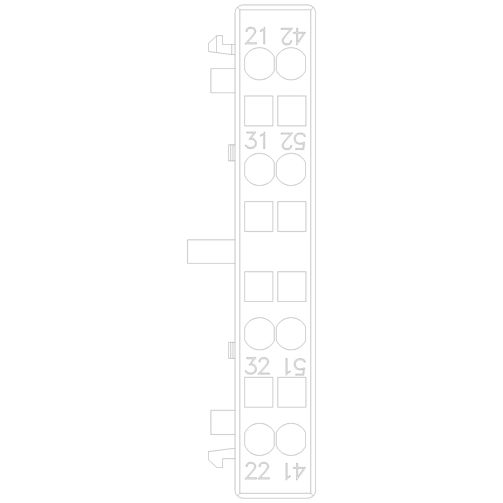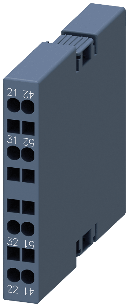 blocchetto di contatti ausiliari, laterale, 2 NC, a sinistra: 41/42, 51/52, a destra: 21/22, 31/32, via di corrente: 1 NC, 1 NC, morsetti a molla, per contattori 3RT2.1 contatto ausiliario SIRIUS 3RH29 per lampliamento dei contatti ausiliari nel circuitodi comando. I blocchetti di contatti ausiliari montabili lateralmente 3RH29 possono essere montati senza attrezzi indipendentemente dalla grandezza costruttiva sui contattori 3RT2. I blocchetti di contatti ausiliari 3RH19/3RH29 sono fornibili come varianti per il montaggio frontale o laterale, con fino a quattro contatti NO con commutazione istantanea o fino a due contatti NO e NC anticipati. I blocchetti di contatti ausiliari possono essere in esecuzione con elementi di contatto a guida forzata in contattori ausiliari 3RH o anche come contatti speculari in contattori di potenza 3RT. Essi sono sempre fornibili con morsetti a vite e morsetti a molla. Semplice, efficiente, sempre attuale - il sistema modulare SIRIUS.