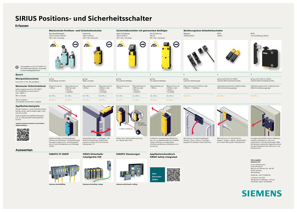 testina di comando per interruttori di posizione 3SE51/52 leva angolare con rotella leva in metallo con rotella in plastica 13 mm meccanismo di avanzamento per interruttore di posizionamento SIRIUS 3SE5 per il rilevamento di posizione di parti di macchina e per la sorveglianza della posizione di dispositivi di protezione. La struttura modulare degli interruttori di posizione 3SE5 consente una molteplicità di varianti con un numero ridotto di tipi da magazzino. Lampia varietà di connettori e rotelle consente di soddisfare tutte le esigenze nella quotidianità industriale. LED segnalano lo stato attuale dellapparecchio. Grazie alla tecnica di collegamento rapida i tempi di cablaggio risultano notevolmente ridotti. Punti di commutazione e fissaggio secondo EN 50047 e EN 50041. Gli apparecchi hanno omologazioni internazionali (IEC, UL). Con le corrispondenti configurazioni di interruttore si possono soddisfare i massimi requisiti di sicurezza secondo PL e o SIL 3. Lelettronica ASIsafe integrata comporta un ridotto assorbimento di corrente. Sono disponibili diverse grandezze di custodia, con diversi contatti, in plastica o in metallo o informa costruttiva compatta. Alcune varianti sono disponibili opzionalmente con visualizzazione di stato a LED e connettore M12. La serie 3SF1 con collegamento diretto al sistema di bus AS-Interface completa la gamma di prodotti. Come accessori sono disponibili, a seconda dellesecuzione, testine di comando e connettori nonché ulteriori accessori di montaggio/collegamento. Safety is a SIRIUS business.