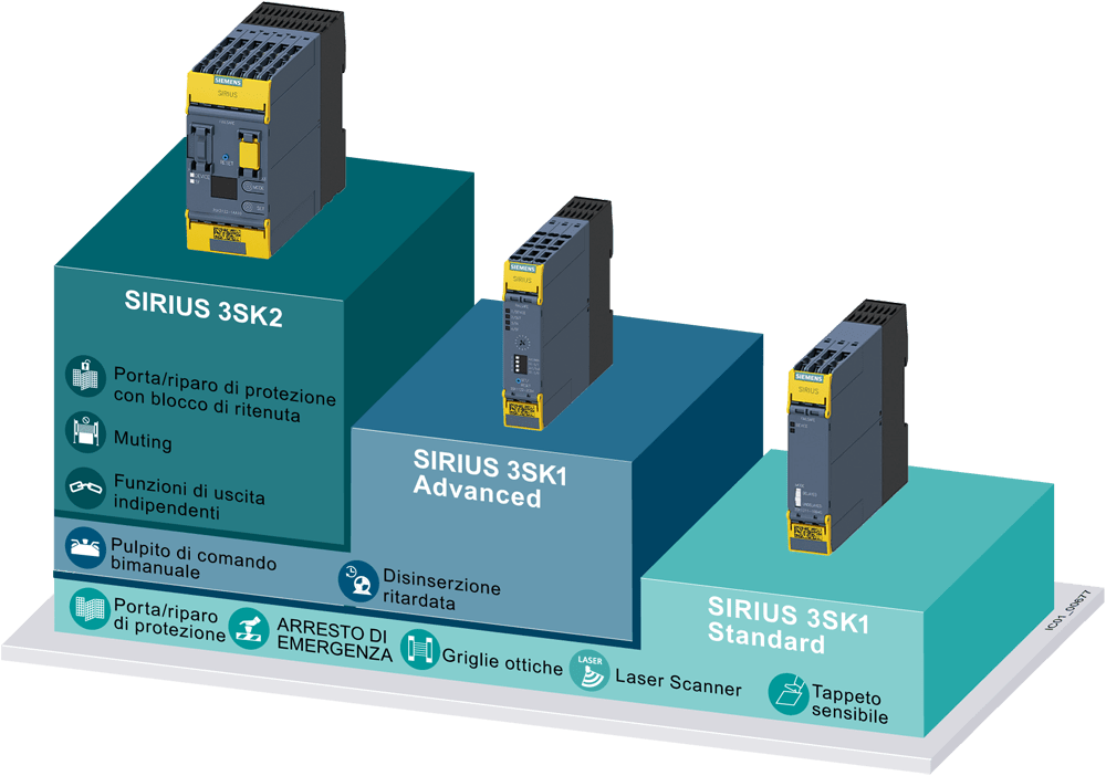 dispositivo di sicurezza SIRIUS modulo di ampliamento uscite 4RO con circuiti di abilitazione a relè 4 contatti NO più circuito di segnalazione relè 1 NC Us = AC 24 V morsetto a molla (Push-in) modulo di ampliamento uscite SIRIUS 3SK1 per dispositivi di sicurezza. I moduli di ampliamento uscite 3SK permettono di aggiungere ulteriori uscite sicure con un potere di manovra fino a 10 A a un modulo di base. Essi possono essere cablati a ogni modulo di base 3SK. Tutti i moduli di ampliamento con una tensione di comando DC 24 V sono collegabili anche tramite i connettori di apparecchiatura 3ZY12 ai moduli di base Advanced 3SK1 e 3SK2. Gli apparecchi dispongono di quattro (AC-15 5 A) o tre (AC-15 10 A) uscite sicure. Si può scegliere tra tensione di comando di 24 V o ampio campo di tensione. Sempre fornibili con morsetti a vite o a molla (push-in). I dispositivi di sicurezza 3SK sostituiscono la comprovata serie costruttiva 3TK28. Safety is a SIRIUS business.