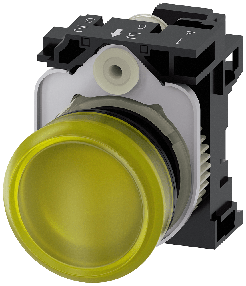 indicatore luminoso, 22 mm, rotondi, in plastica, giallo, lente, liscio, con supporto, modulo LED, con LED integrato AC/DC 24V, morsetto a molla Indicatore luminoso SIRIUS ACT per la segnalazione di stati di commutazione o guasti in impianti, con forte intensità luminosa grazie alla tecnologia LED ad efficienza energetica. Siemens offre, sotto il nome commerciale SIRIUS ACT, un portfolio esclusivo di dispositivi di comando e segnalazione con omologazioni di prodotto per il mercato mondiale in tre moderneserie di design in robusto metallo puro e plastica pregiata.Linnovativo concetto di innesto a scatto semplifica talmente il montaggio che per eseguirlo basta una sola mano e non servono attrezzi speciali. Per i fori di montaggio sono sufficienti semplicifori non scanalati, essendo già integrata una protezione antirotazione al 100 %.Grazie al grado di protezione elevato i robusti apparecchi sono adatti allimpiego industriale e in ambiente esterno. È persino possibile la pulizia con getto ad alta pressione. Né polvere, né oli, né liscivia possono comprometterne il funzionamento affidabile.Oltre che con il cablaggio standard, gli apparecchi possono essere collegati al controllore anche tramite PROFINET, AS-Interface oppure IO-Link. Potete così ridurre il vostro onere di cablaggio, minimizzare le fonti di errore e ottenere maggiore flessibilità.Il configuratore online grafico supporta in modo confortevole la scelta e lordinazione di singoli apparecchi, pulsantiere e iscrizioni. È disponibile una documentazione completa (ad es. manuale, dati 3D, schema di collegamento). Esecuzioni fornibili: più colori, diverse varianti di tensione. Avvertenza: Apparecchio completo, fornitura incl. supporto e moduli. SIRIUS ACT - Performance in Action nel comando e nella segnalazione. Semplici da montare, altamente performanti, semplicemente perfetti.