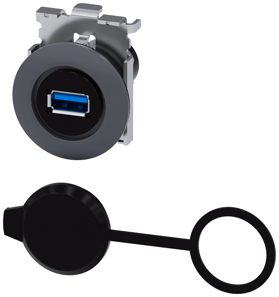 connessione USB tipo A 3.0, 30 mm, metallo opaco, grigio sabbia Connessione USB tipo A come accessori per dispositivi di comando e segnalazione SIRIUS ACT. Siemens offre, sotto il nome commerciale SIRIUS ACT, un portfolio esclusivo di dispositivi di comando e segnalazione con omologazioni di prodotto per il mercato mondiale in tre moderne serie di design in robusto metallo puro e plastica pregiata.Linnovativo concetto di innesto a scatto semplifica talmente il montaggio che per eseguirlo basta una sola mano e non servono attrezzi speciali. Per i fori di montaggio sono sufficienti semplici fori non scanalati, essendo già integrata una protezione antirotazione al 100 %.Grazie al grado di protezione elevato i robusti apparecchi sono adatti allimpiego industriale e in ambiente esterno. È persino possibile la pulizia con getto ad alta pressione. Né polvere, né oli, né liscivia possono comprometterne il funzionamento affidabile.Oltre che con il cablaggio standard, gli apparecchi possono essere collegati al controllore anche tramite PROFINET, AS-Interface oppure IO-Link. Potete così ridurre il vostro onere di cablaggio, minimizzare le fonti di errore e ottenere maggiore flessibilità.Il configuratore online grafico supporta in modo confortevole la scelta e lordinazione di singoli apparecchi, pulsantiere e iscrizioni. È disponibile una documentazione completa (ad es. manuale, dati 3D, schema di collegamento). Ampia gamma di accessori opzionali (ad es. targhette identificative, per protezione e accesso, operatori,accessori per pulsantiere). SIRIUS ACT - Performance in Action nel comando e nella segnalazione. Semplici da montare, altamente performanti, semplicemente perfetti.