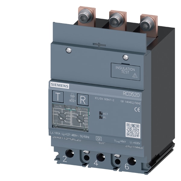 dispositivo di protezione differenziale RCD520 Basic RCD Tipo A montato in basso corrente di guasto nominale 0,03 ... 5 A a 50/60 Hz tempo regolabile 0 ... 3000 ms a 3 poli In=160A Ue=100-480V Accessori per: 3VA1 Interruttori automatici scatolati SENTRON3VA - un sistema. Per tutte le applicazioni.