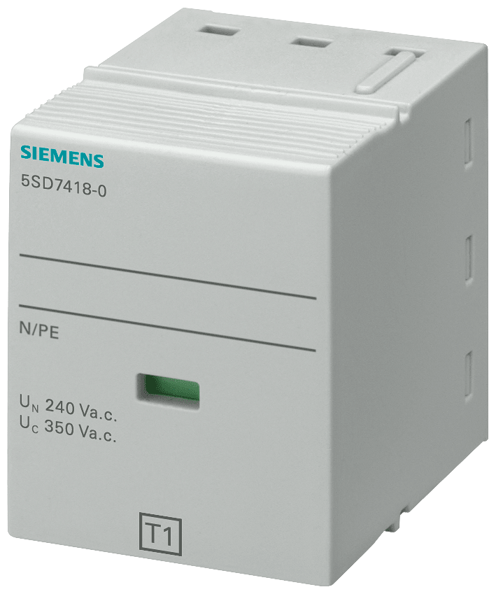 cartuccia estraibile tipo 1 N-PE classe di requisiti B, Uc 350V a 1 polo per scaricatori combinati 5SD744... e scaricatori di sovratensioni di origine atmosferica 5SD741 Apparecchi di protezione da sovratensione in impianti elettrici. Gli apparecchi di protezione da sovratensioni Siemens si contraddistinguono soprattutto per le seguenti caratteristiche: 1. Protezione efficace dellinvestimento e dellimpianto da fulmini e sovratensioni. 2. La protezione da fulmini e sovratensioni adatta per ogni caso applicativo (tipo da 1 a 3). 3. Contatto di segnalazione a distanza per lupload esterno della visualizzazione di stato. 4. Sicurezza affidabile durante linstallazione grazie alla protezione avvolgente e alla protezione contro i contatti accidentali come standard di serie. 5. Rimozione senza attrezzi dalla guida DIN. 6. Visualizzazione errore chiaramente visibile. 7. Il codice DataMatrix sul frontale dellapparecchio fornisce tutte le informazioni sulla protezione da fulmini e sovratensioni in modo rapido e semplice. 8. Tecnica ottimale per la vostra sicurezza - solo da Siemens. Siemens offre una gamma completa di apparecchi di protezione, manovra, misura e controllo, sistemi di quadri di distribuzione nonché interruttori e prese di corrente per una infrastruttura elettrica sicura ed efficiente in edifici residenziali e industriali.