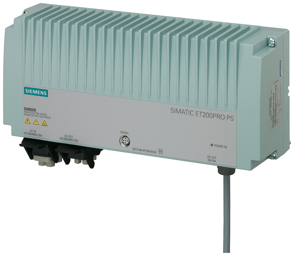SIMATIC ET200pro PS alimentatore regolato con grado di protezione IP67 ingresso: 3 AC 400-480 V uscita: DC 24 V/8 A Lalimentatore da rete SIMATIC ET200pro PS con grado di protezione IP67 serve per alimentare elettronica, trasduttori e carichi dellapparecchiatura di periferia e dispone di un contatto di segnalazione per 24 V O. K. e Sovratemperatura nonché di un secondo connettore per il collegamento in cascata della tensione di ingresso. Indipendentemente dal settore o dallesigenza, Siemens offre alimentatori affidabili ed efficienti per ogni impianto.