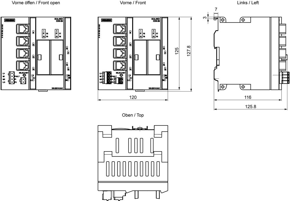 SCALANCE X308-2M; managed IE Switch, compatto; 4x 10/100/1000 Mbit/s per porte RJ45 elettriche; 2x 100/1000 Mbit/s per media module a 2 porte, elettriche oppure ottiche; diagnostica LED; contatto di segnalazione ; pulsante Select/Set; PROFINET IO Device;Network management; integrato manager di ridondanza; Office Features (RSTP, VLAN, IGMP,..); C-PLUG nella dotazione di fornitura. SCALANCE X308-2M managed, switch compatto di Layer 2, 4x RJ45 da 10/100/1000 Mbit/s, 2x 100/1000 Mbit/s per Media-Modules perla strutturazione flessibile di reti dimpianto performanti. Switch per quadro elettrico SCALANCE X308-2M flessibile e salvaspazio: la prossima generazione di reti industriali combina OT e IT per una produzione più flessibile e sicura. I nostri switch Ethernet SCALANCE X-300 come dispositivi compatti o come switch a 19 per il quadro elettrico assicurano un elevato livello di funzionalità e flessibilità con Industrial Edge e, in futuro, anche con Time-Sensitive Networking (TSN). Scoprite i molteplici vantaggi della nostra serie di apparecchi SCALANCE X-300: dagli switch per il quadro elettrico da utilizzare negli ambienti industriali agli switch Ethernet in design compatto, fino agli switch per le condizioni industriali più gravose: con SCALANCE X308-2M sitrova sempre il giusto switch per numerose applicazioni.