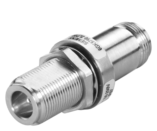 Lightning Protector LP798-1N, elemento di protezione antifulmine con connessione femmina/femmina, IP66/68 (-40 ... +85 °C), 0 ..... 6 GHz, con tecnologia di scarico del gas per antenne SCALANCE W ed M, istruzioni compatte cartacee tedesco/inglese. SIMATIC NETLP798-1N lightning protector
