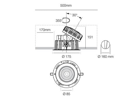 Proiettore da incasso orientabile a LED in bassa luminanza. Corpo e dissipatore in pressofusione di alluminio verniciato nero. Staffa orientabile graduata in metallo verniciato nero. Orientabilità sul piano orizzontale di 355° e di 30° su quello verticale con sistema di regolazione micrometrica. Doppio blocco del puntamento. Sistema di dissipazione passiva. LED Chip on Board alta efficienza Ra 84. Riflettore secondario in policarbonato con finitura inferiore metallizzata matt e finitura superiore nera texturizzata antiabbagliamento; gruppo ottico primario completo di ottica di precisione a sfaccettature convesse in policarbonato metallizzato ad alta specularità con trattamento “Scratch Proof Formula” anti graffio o completo di ottica ibrida - riflettore in alluminio anodizzato esistema di lenti in vetro ottico. Sistema di aggancio ultra rapido no tools per installazioni in controsoffitti da 0,5 a 30 mm. Da completare con anello decorativo. Completo di driver nelle versioni: elettronica. Kit emergenza completo di pacco batterie da 3h disponibile come accessorio. LED MONOCHROMATIC 33W 3000K.