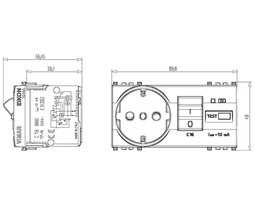 Presa SICURY 2P+T 16 A standard italiano tipo P30 (contatti di terra laterali e centrale), interbloccata con interruttore automatico magnetotermico differenziale 1P+N C 16, 230 V~ 50 Hz, I¿n 10 mA, p.i. 3000 A, bianco - 4 moduli