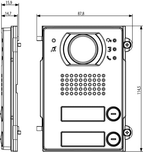 Modulo frontale audio/video con 2 pulsanti e simbolo teleloop per protesi acustiche, Pixel Heavy, per unità elettronica audio 41004, grigio sablé. Protezione agli impatti meccanici esterni IK10, grado di protezione IP54.