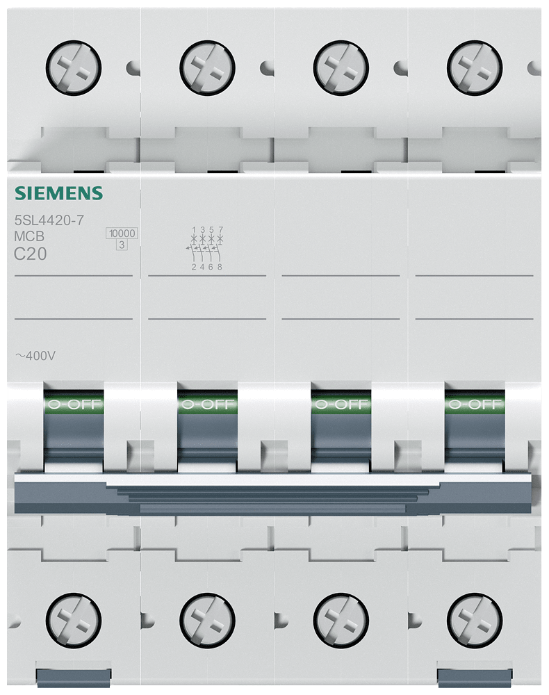Interruttore magnetotermico 400V 10 kA, a 4 poli, C, 20A Interruttore magnetotermico SENTRON per la protezione da cortocircuito e sovraccarico sicura per applicazioni standard in edifici residenziali e funzionali. Montaggio e smontaggio dellapparecchio senza attrezzi. Semplice cablaggio dellalimentazione mediante la sbarra collettrice posteriore. Gli interruttori magnetotermici 5SL sono disponibili in esecuzione a 1, 2, 3, 4 poli nonché a 1 polo +N e a 3 poli +N nonché in ulteriori tipi speciali. I numerosi accessori, come ad es. i blocchetti di contatti ausiliari, consentono una varietà di ampliamenti funzionali. Semplicemente sicuri con gli apparecchi di protezione di SENTRON.