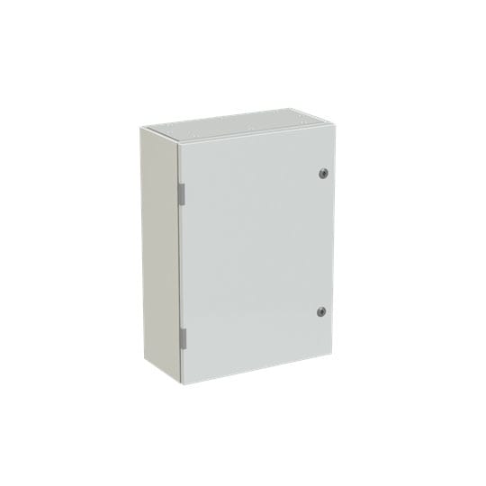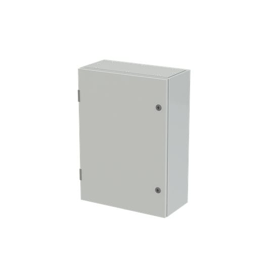 Cassa con porta cieca e piastra di fondo serie SR2, struttura in lamiera d'acciaio spessore 12/10, piastra di fondo in lamiera zincata spessore 20/10. Utilizzata per la realizzazione di quadri di comando e controllo delle più varie macchine industriali: da grossi macchinari a linee automatizzate di produzione o parti di esse, alle tipiche installazioni di quadri bordo macchina, a caldaie, impianti di riscaldamento ed altro ancora.