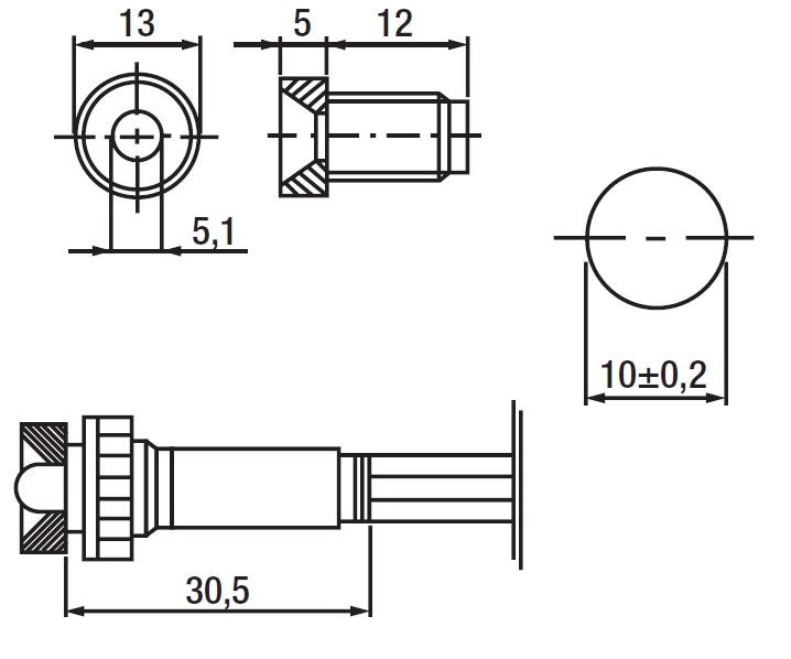 Indicatore luminoso LED • Corpo cilindrico filettato - policarbonato • Ghiera cromata alta Ø 13 mm • Cavetti PVC 0,50 mm² - lunghezza 200 mm • Led Ø 5 mm