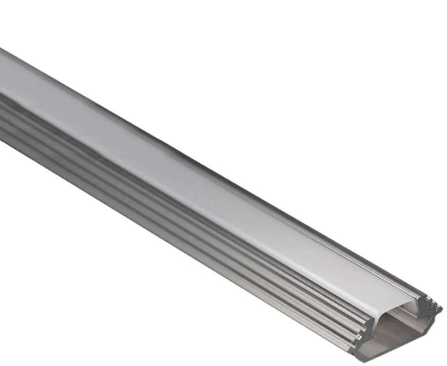 Profilo in alluminio anodizzato, per montaggio ad angolo. Con diffusore in policarbonato satinato. Lunghezza: 2 m. Dimensioni: 25 x 10 mm.