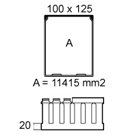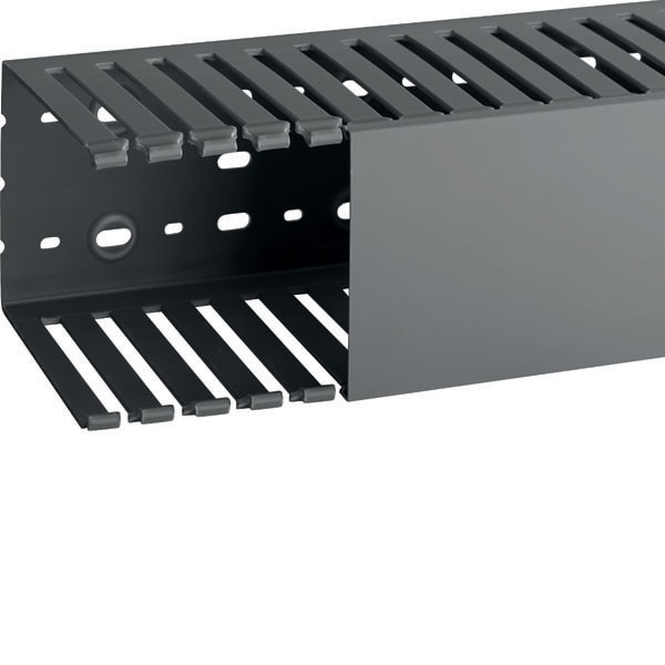 Canalette in PVC autoestinguente per cablaggio quadri elettrici, progettate per gestire e proteggere i cavi in modo efficiente. Misurano b100 x h125 mm con modulo da 20 mm (feritoia 8 mm, lamella 12 mm). Offrono resistenza al filo incandescente fino a 960 °C (GWT EN 60695-2-11) e conformità UL94 V0. Colore grigio RAL 7030, lunghezza 2 m, fornite con coperchio per un'installazione sicura e ordinata.