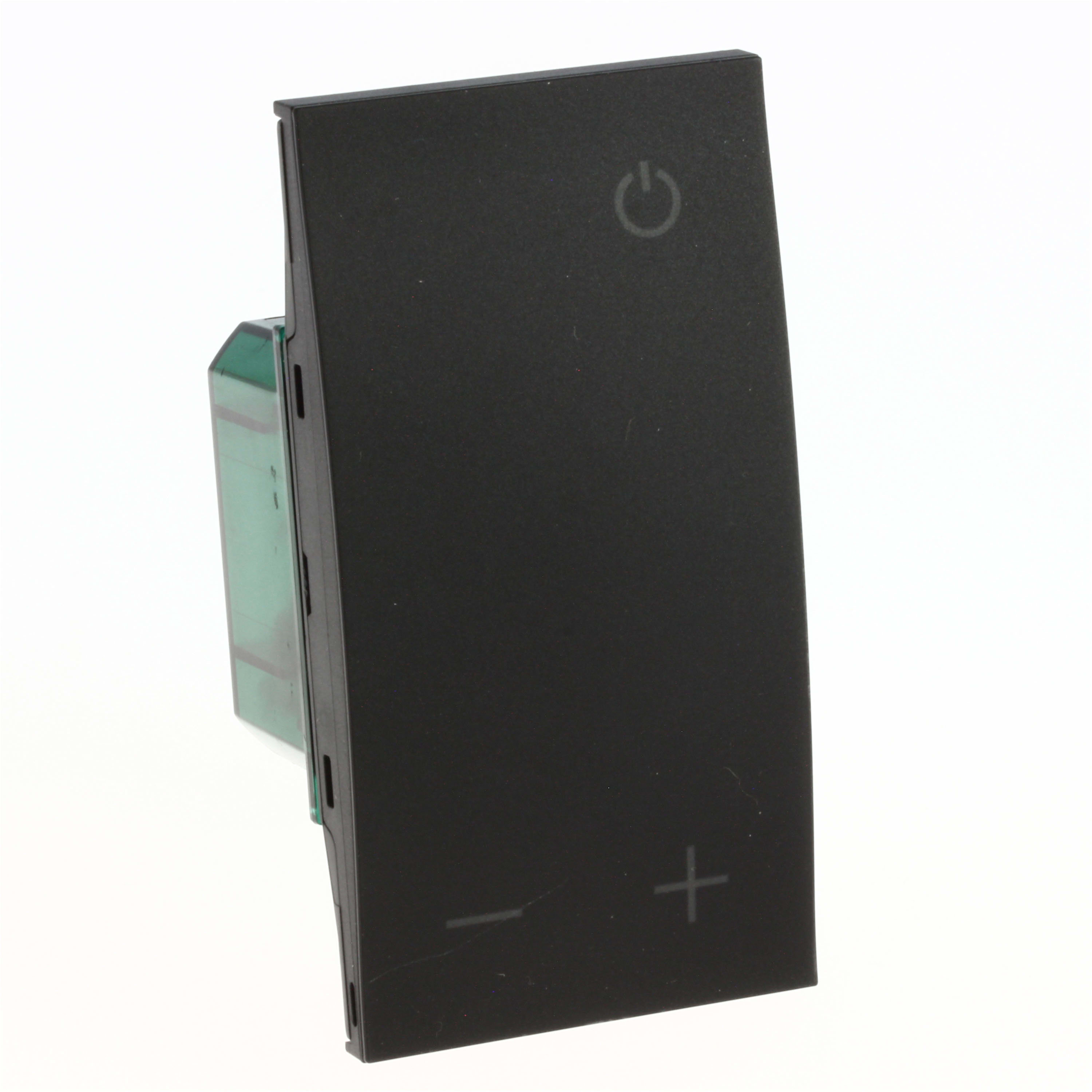Sonda con display retroilluminato per il controllo della temperatura di una singola zona. È dotato di un ingresso per il collegamento di una linea contatti (es. contatto finestra). Permette la gestione di diverse tipologie di impianto e la regolazione della velocità della ventola in caso di impiego di fan coils. Possibilità di funzionamento automatico (estate/inverno) con impianti compatibili - 2 moduli, nero