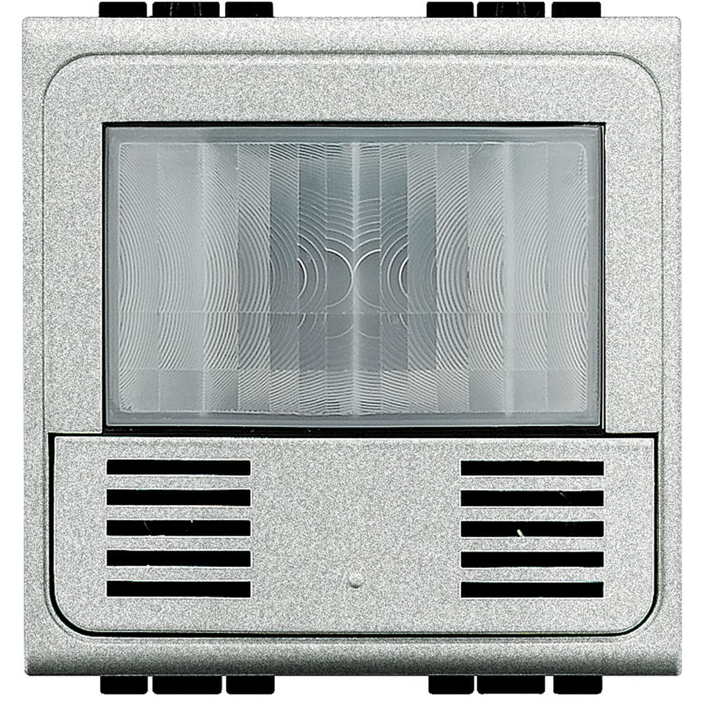 Green Switch: Sensore BUS-SCS a doppia tecnologia: infrarossi passivi (PIR) ed ultrasuoni (US), adatto per il rilevamento della presenza e del livello di illuminamento, installazione ad incasso in serie civile (Axolute, LivingLight o Màtix), dimensioni 2moduli, grado di protezione IP20, connessione tramite connettore SCS, area di copertura frontale di 8m per un ampiezza di 180° ad un’altezza di installazione di 1.2 m, altezza massima di installazione di 1.2 m, alimentazione 27 V d.c., regolazione tramite telecomando base/avanzato (088240 e BMSO4001) o tramite gli appositi software di configurazione, del livello di illuminamento da 5 lux a 1275 lux, del tempo di ritardo da 5 s a 59m e dei principali parametri di funzionamento.