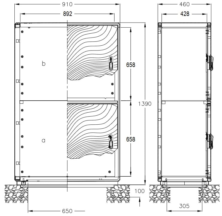 Armadio a 2 vani apparecchiature integrati in unica struttura di sostegno separati da setto intermedio; in vetroresina (SMC) colore RAL 7038. Maniglia in resina termoplastica, tenone di manovra in acciaio zincato; aste e paletti interni in acciaio con trattamento GEOMET 321. Cerniere esterne non accessibili in acciaio inox. Telaio in acciaio zincato e verniciato. Guarnizioni di tenuta realizzate in EPDM espanso. Tensione nominale di isolamento Ui 690V. Completo di telaio di ancoraggio per installazione su basamento in calcestruzzo. Porte incernierate complete di chiusura azionabile con maniglia a scomparsa e serratura di sicurezza a cifratura unica Y21 (cilindro a profi lato DIN18252-a richiesta cifrature personalizzate). Equipaggiabile con piastre di fondo e accessori dedicati per realizzazione quadri. Pareti di fondo munite di borchie predisposte per inserimento di inserti filettati con prigioniero per fissaggio accessori M6 x 20.