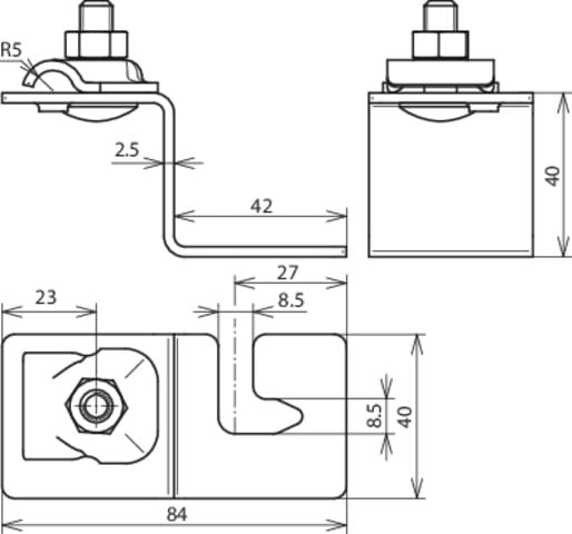 Staffa portafilo per tetti per il fissaggio di dispositivi di captazione supplementari come captatori su tetti metallici. Esecuzione per tetti trapezoidali da agganciare alle viti di fissaggio del tetto, con cavallotto di fissaggio, posa fissa del conduttore.