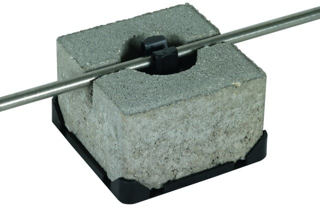Staffa portafilo per tetti con fissaggio unico del conduttore tipo FB, per il fissaggio di conduttori tondi o nastri (con adattatore) con posa libera del conduttore su tetti piani. Esecuzione componibile di staffa portafilo con base di supporto in materiale plastico resistente alle intemperie, stabilizzato ai raggi UV e privo di alogeni, con zoccolo montato a scatto, in cemento resistente al gelo. Zoccolo e base riciclabili separatamente.